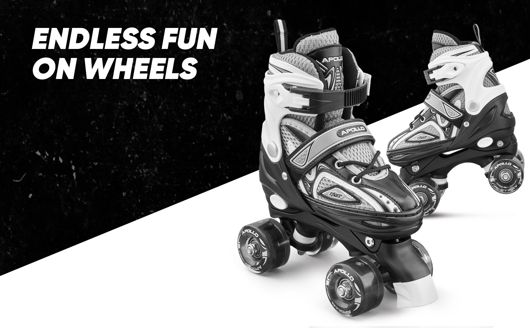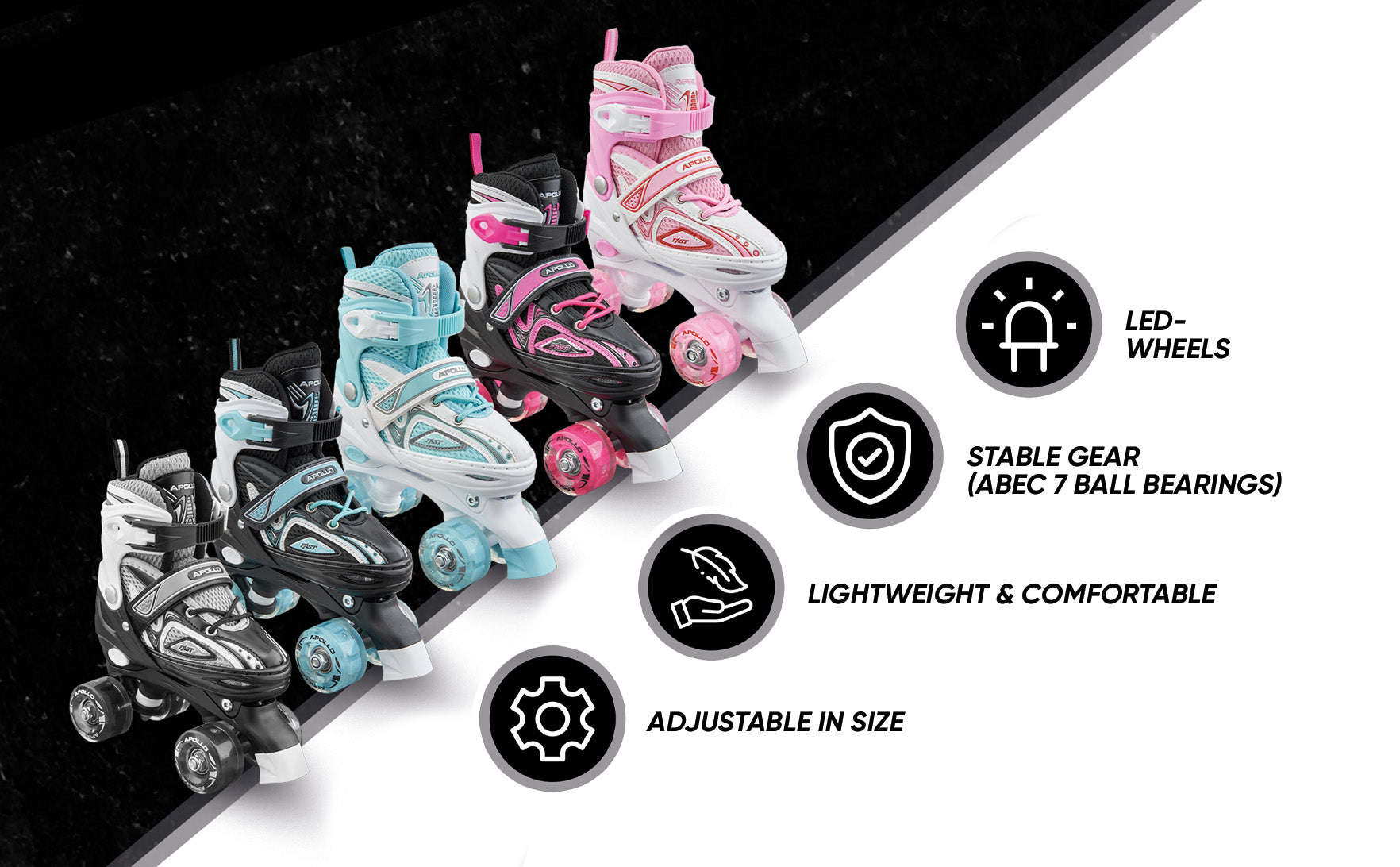 BRAND PRODUCT: Apollo Super Quads X Pro Skates - cool design, LED wheels and optimal riding characteristics thanks to High Rebound wheels (54 mm x 32 mm) and ABEC 7 bearings.