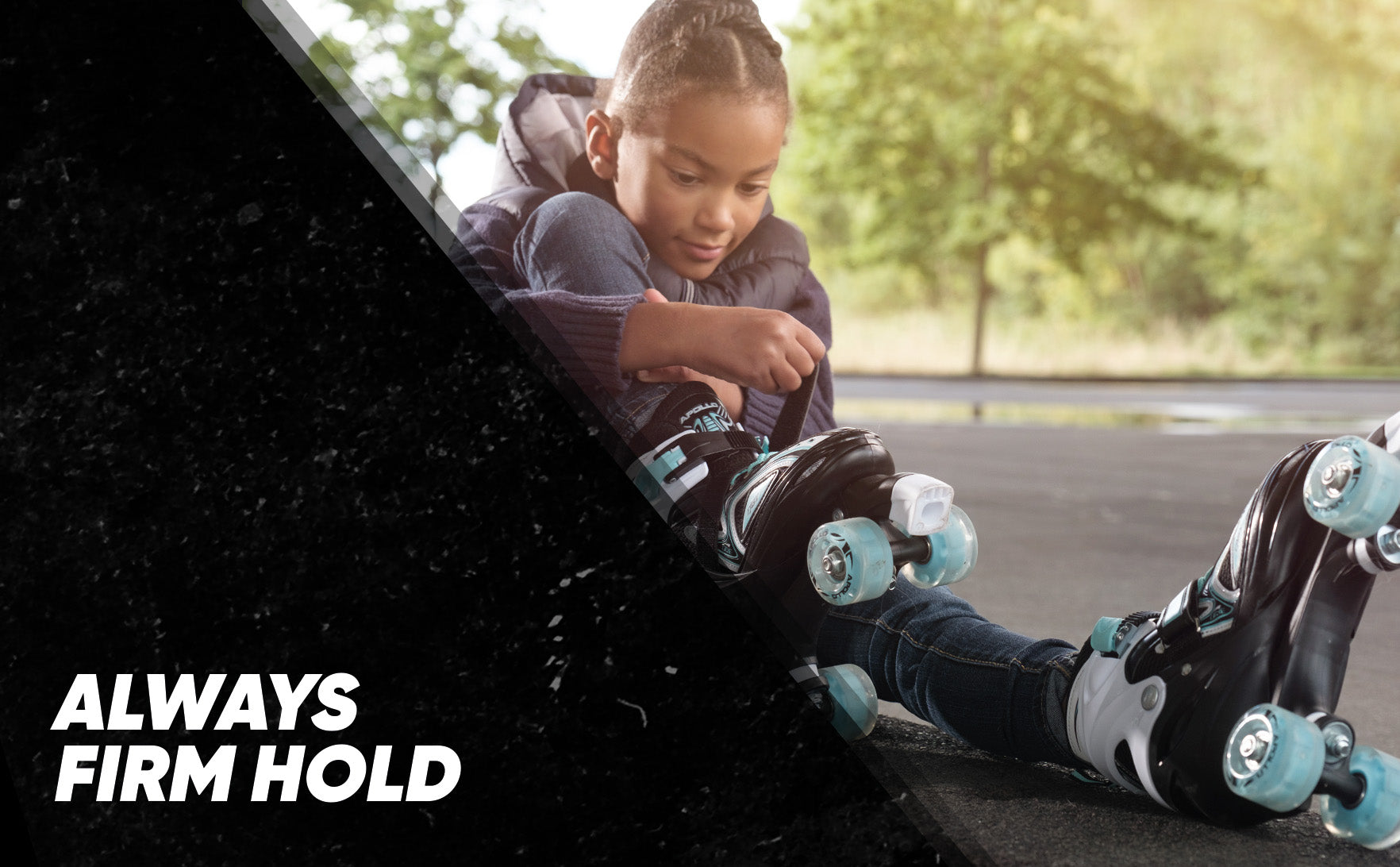 QUICK-CLOSURE SYSTEM: Kids' roller skates with grid lock, safety buckle, hook-and-loop closure and laces for a secure fit.